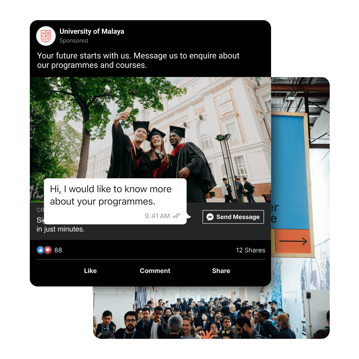 Design recruitment strategies around instant messaging, from using digital prospectuses as lead magnets or a trigger for drip campaigns to driving conversations via click-to-chat links and ads.