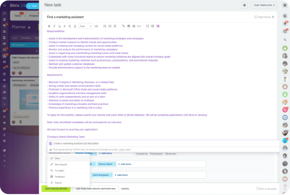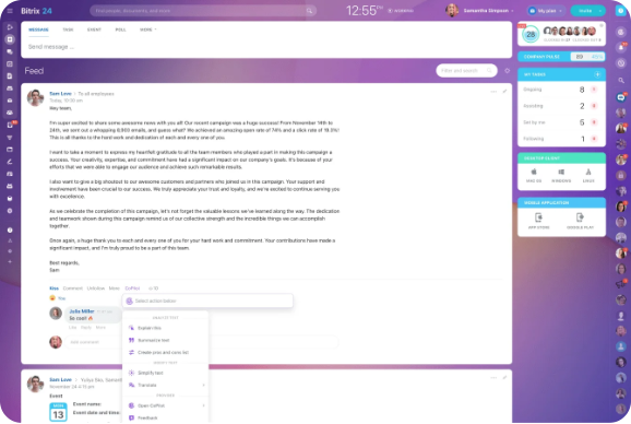 One of the most obvious places to find CoPilot in Bitrix24 is our chat. There, you can use it to generate ideas, write texts, and do all kinds of AI magic.