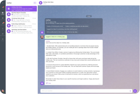 There are plenty of tasks you can assign to CoPilot in the sales department – e.g., create original ideas for your special offer, write compelling copy for a promotional email, or even transcribe your phone call with a client.
