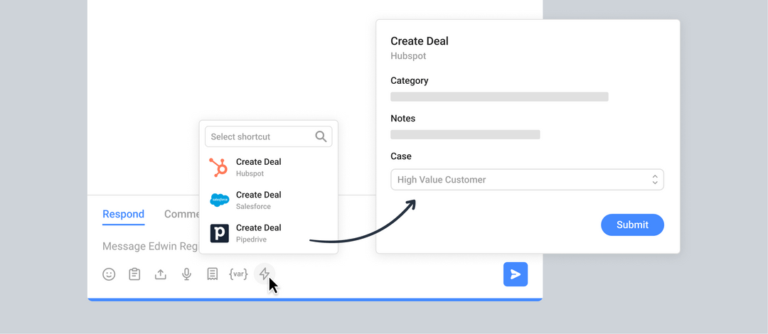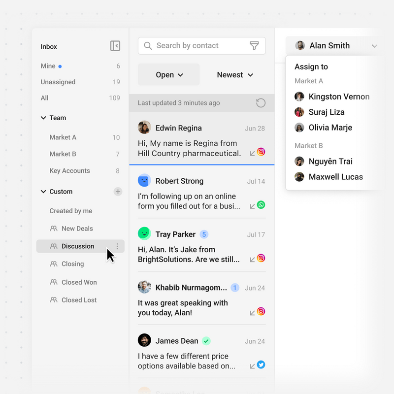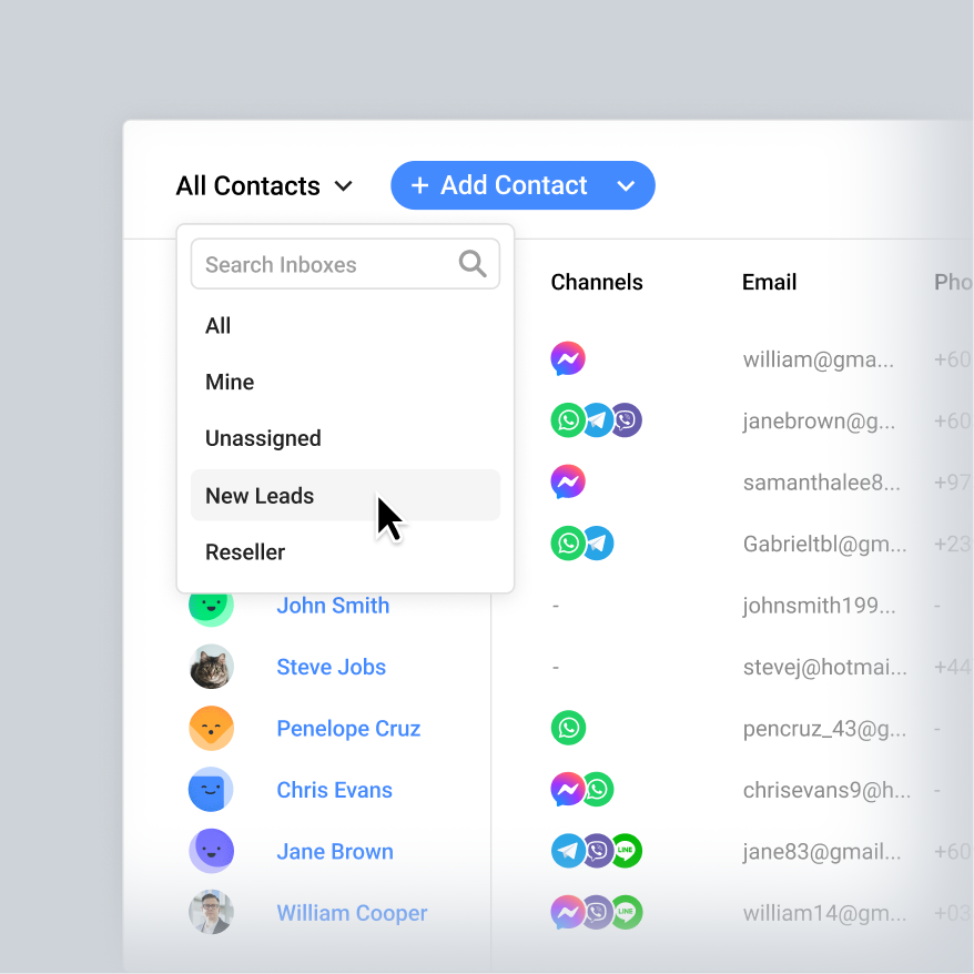 Optimize your sales cycle and retain a single source of truth for customer data. Integrate sales CRMs such as HubSpot, Salesforce, Pipedrive or Zoho with your messaging inbox and automation.